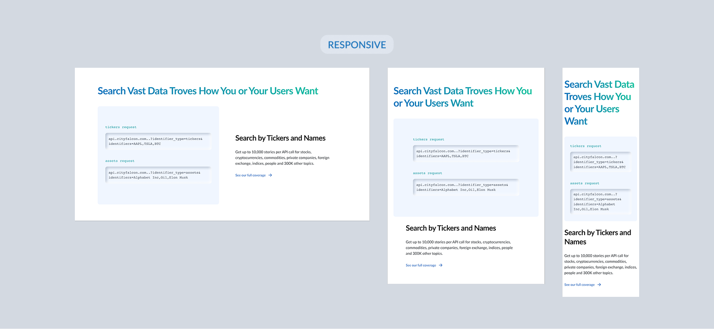 A refreshed and restructured product page for a financial data provider’s News & Research API, designed to modernize the look and feel, clarify complex information, and drive conversions — all within brand guidelines. Final build was done in Webflow, fully responsive and optimized for performance.